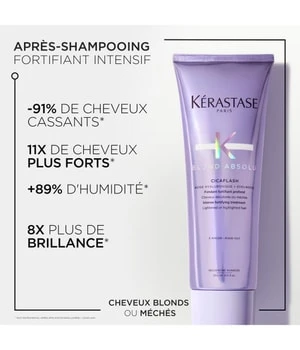 Soin réparateur pour cheveux blonds sensibilisés par les mèches ou la décoloration. Il restaure, lisse et renforce la fibre capillaire. Les cheveux gardent un toucher léger, quelle que soit leur nuance de blond.
